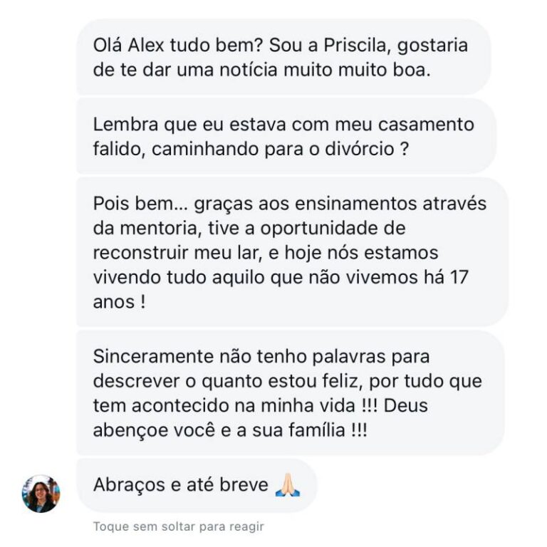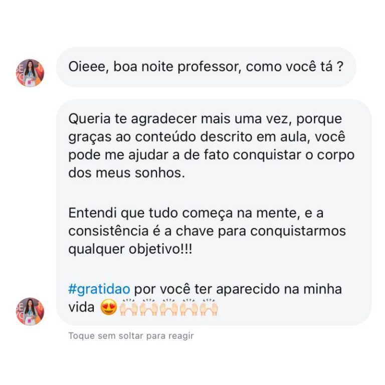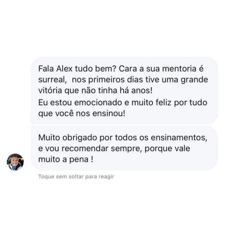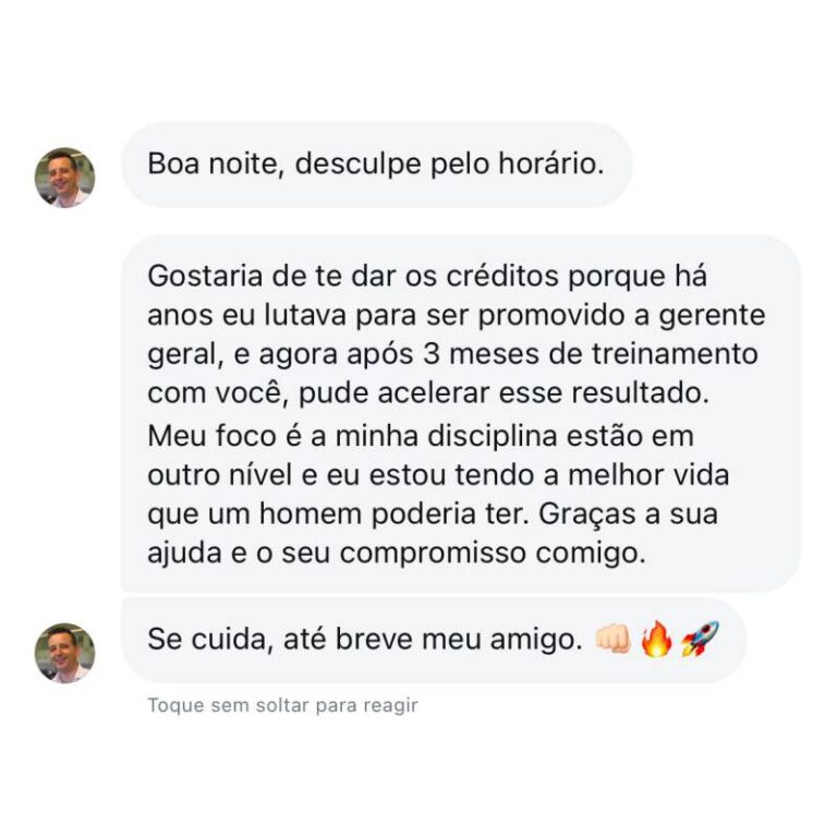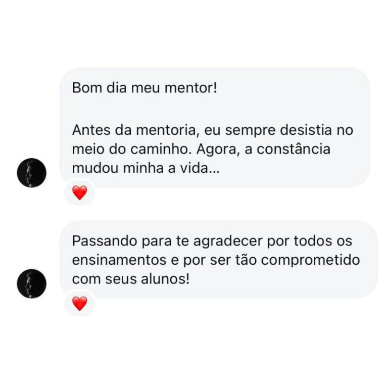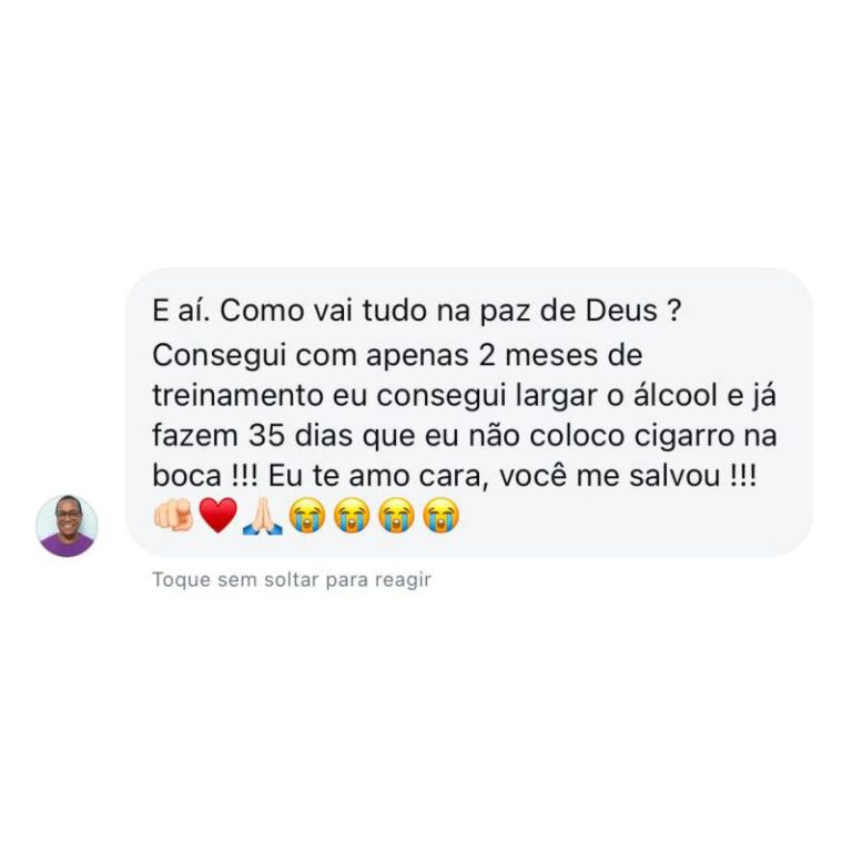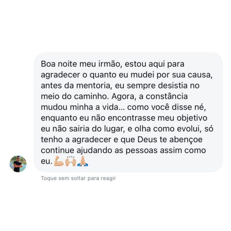 Foi então que decidi mudar. Dediquei 4 anos intensos ao estudo de foco, disciplina, constância e gestão do tempo, aprendendo com os melhores especialistas do Brasil e grandes nomes internacionais, como Tony Robbins. Aos 23 anos, consegui não apenas transformar minha própria vida, mas também ajudar minha mãe a eliminar mais de 30 kg e orientar dezenas de pessoas a alcançarem seus objetivos.
