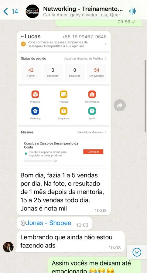 Todos os meses, você terá um encontro ao vivo com o Jonas Monteiro para ajustar sua estratégia, analisar sua conta e receber direcionamento direto de quem carrega o selo de Mentoria Oficial da Shopee.