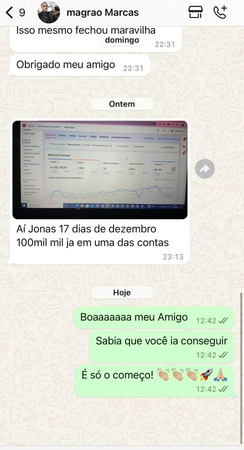 Diferente de quem apenas ensina a criar uma loja, Jonas vive o campo de batalha diariamente. Em 2024, ele consolidou sua expertise ao atingir o marco histórico de R$ 1 milhão em vendas em um único mês, acumulando um faturamento total superior a R$ 14 milhões.